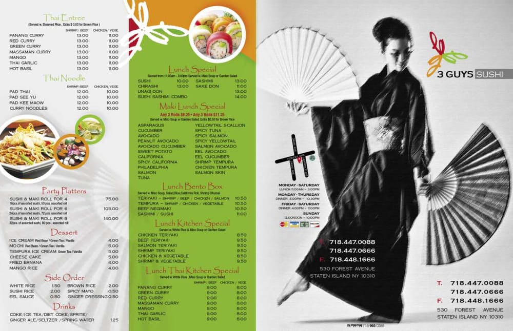 Welcome to 3 Guys Sushi, a hidden gem in Staten Island offering a fusion of Japanese and Thai cuisine. Located on Forest Ave, this restaurant excels in providing a serene dining experience. With a diverse menu featuring stir-fry noodles, special sushi rolls, and must-try kani salad, 3 Guys Sushi has impressed customers like Irene, Fatima, and Doreen with their fresh and flavorful dishes.